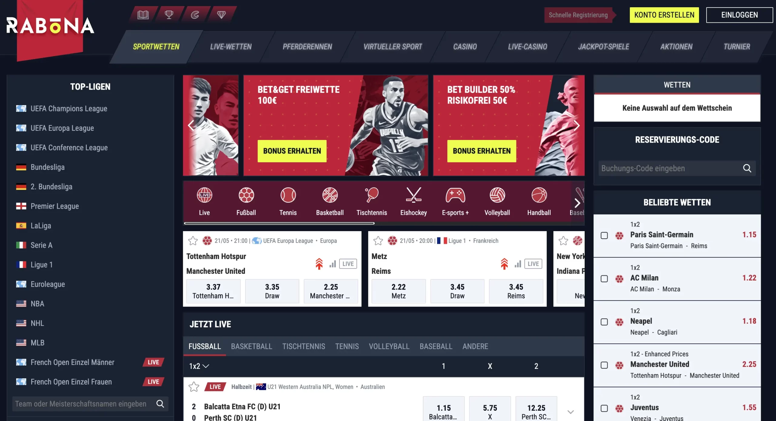 Darüber hinaus bietet Rabona bet eine sichere und angenehme Wettatmosphäre, was uns zu einem vertrauenswürdigen Unternehmen in der Glücksspielbranche macht. Auf unserer offiziellen Website finden Wettende über 180 verschiedene Sportarten, darunter Fußball, Tennis, Hockey und vieles mehr.