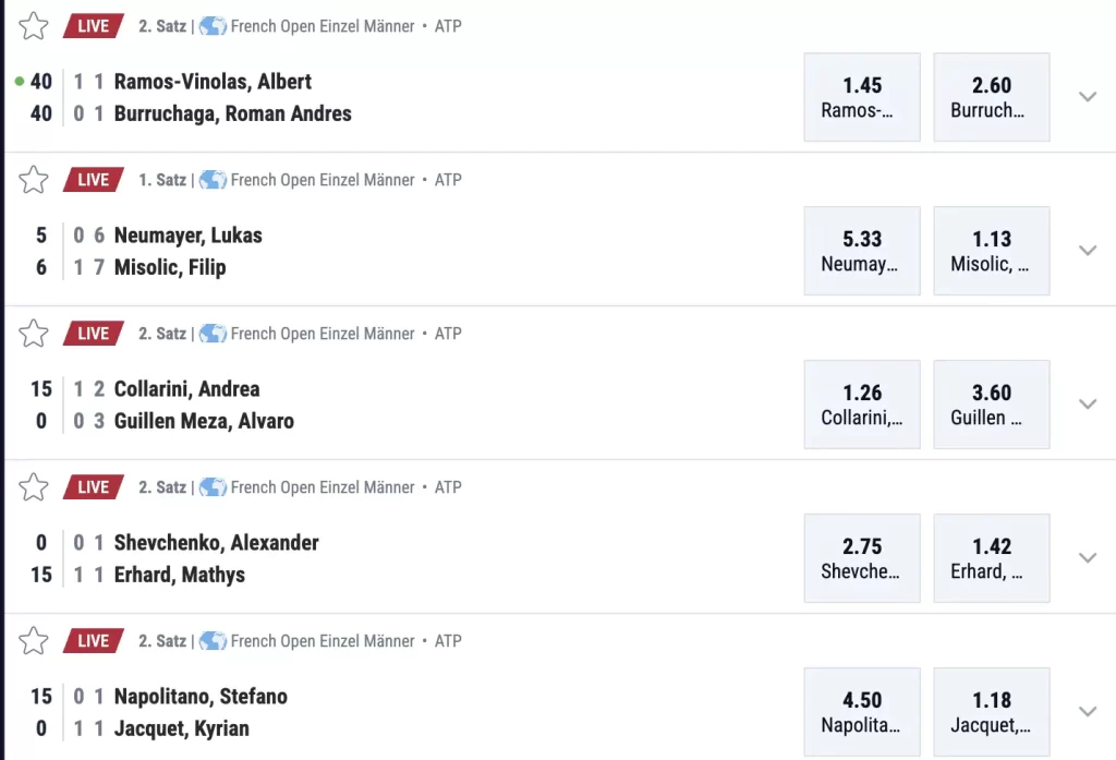 Wir ermutigen Tennisfans, ihr Glück bei Rabona Bet zu versuchen! Ein Spiel wie dieses ist ein echter Hingucker. Insgesamt stehen 32 Wettbewerbe zur Verfügung, und Sie können auf Ihre Lieblings-Tennisspieler setzen, um bei Spielen auf der ganzen Welt erfolgreich zu sein.
